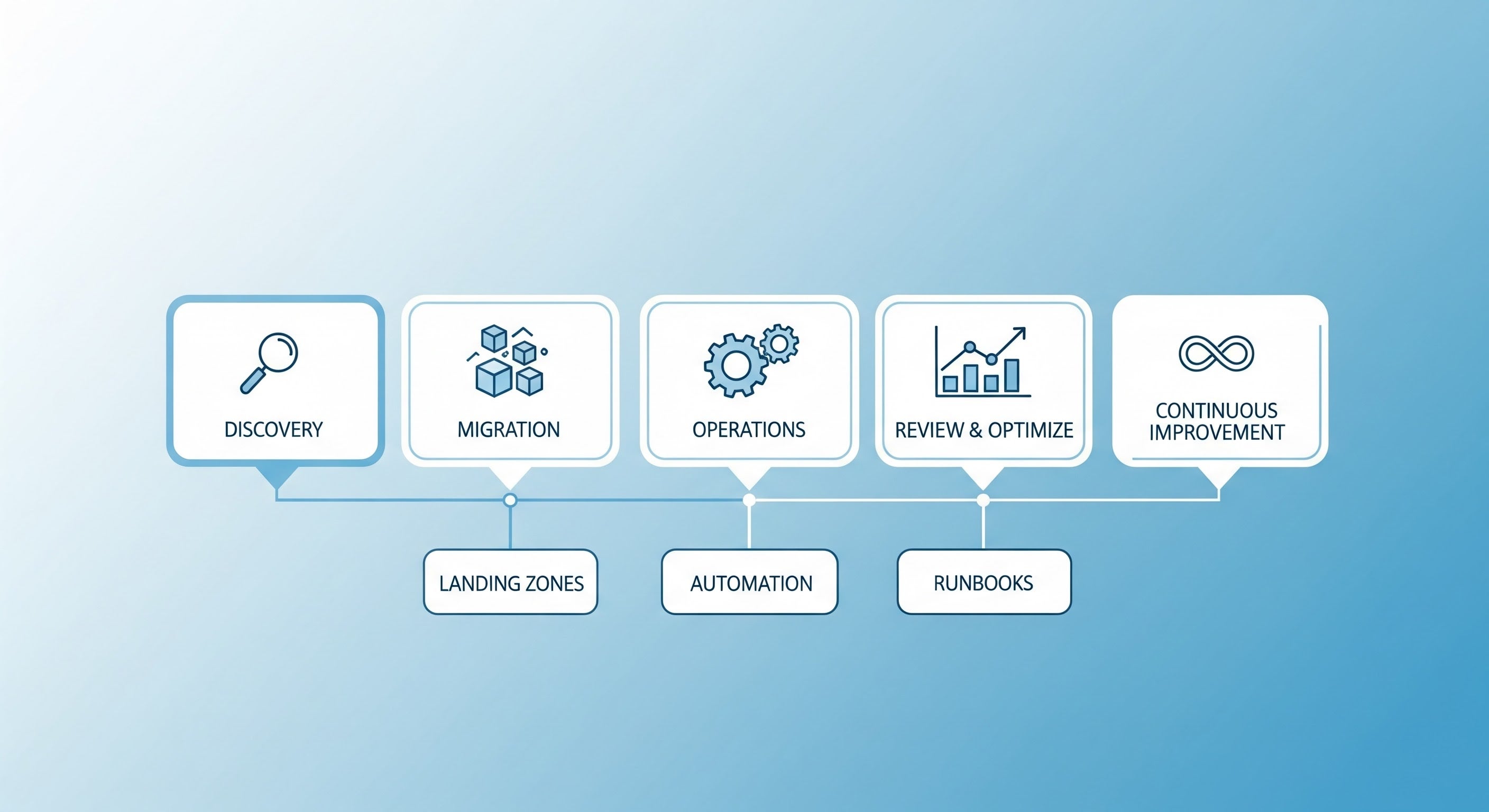 ตั้งแต่การย้ายระบบขึ้นคลาวด์จนถึงการบริหาร FinOps เราดูแลตลอดวงจรชีวิตของระบบ จัดการ Landing Zone, Automation, Backup, และ Policy ให้ครบถ้วน พร้อมวิเคราะห์ประสิทธิภาพและค่าใช้จ่ายอย่างต่อเนื่อง เพื่อให้ระบบคลาวด์มั่นคงและคุ้มค่าที่สุด